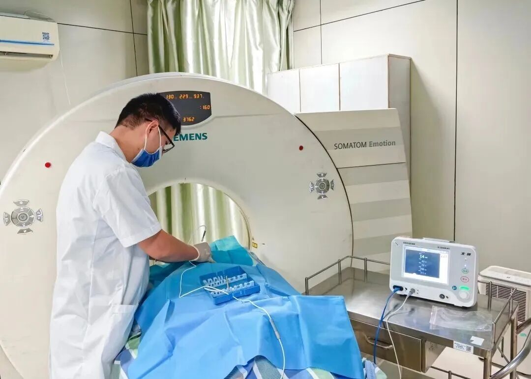 确认目标神经后,治疗进入关键阶段。在CT机的实时引导下,一根比针灸针还细的射频针被精准穿刺至神经旁。随着机器发送微弱电流,郑女士颈部传来一阵熟悉的“胀痛感”,这是针尖位置准确的信号。随后,脉冲射频模式启动,360秒的治疗过程中,仪器通过特定频率的电流调节神经功能,整个操作仅需在针眼处贴一张创可贴即可完成。