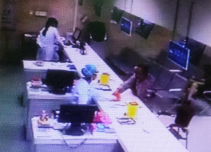 护士将蛋糕递给老人时的监控视频截图。 检验科 供图