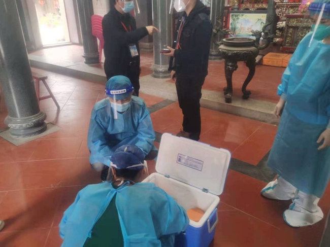 戴慧琴正在西苑村采集点现场指导,在书峰村现场查看穿脱防护服是否规范。李珊、何梅芬、林朝、彭纪龙、周君、沈婷婷等人正在郊尾镇埕边村采集点巡回质控。李珊、林朝、何梅芬、周君、彭纪龙、沈婷婷等人在郊尾镇东湖村采集点巡回质控。李珊、林朝等人在仙游县枫亭镇巡回质控。