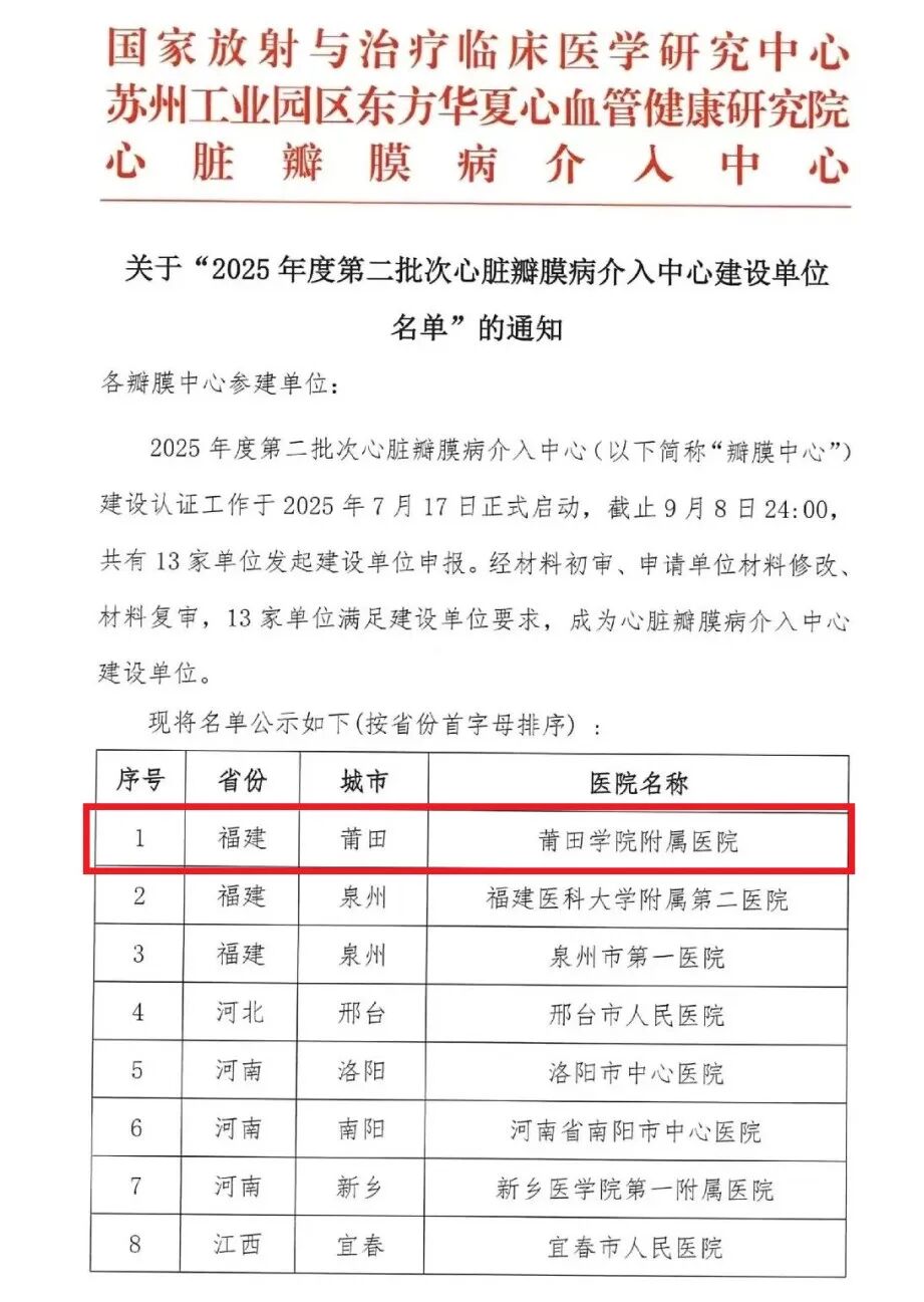 第二批次心脏瓣膜病介入中心(以下简称“瓣膜中心”)建设认证工作于2025年7月启动,经过严格遴选与综合评审,全国共13家医疗机构入选。我院心血管内科凭借在心脏瓣膜介入领域的扎实基础和卓越表现,成功跻身该行列。