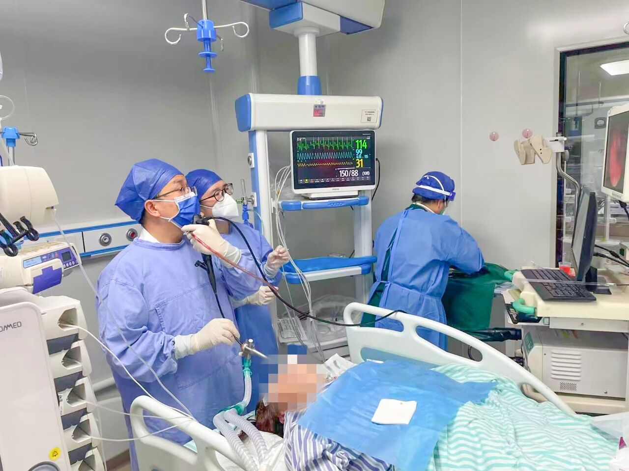 时间就是生命。医院迅速启动多学科协作机制,呼吸与危重症医学科、内镜中心、胸心外科、麻醉科等多科室专家紧急会诊。鉴于异物位置特殊、形态尖锐,取出过程中极易造成穿透性损伤和大出血,专家团队反复评估后,决定为患者实施喉罩下全身麻醉,先通过胃镜尝试取出消化道内异物,同时借助气管镜探查肺部异物。